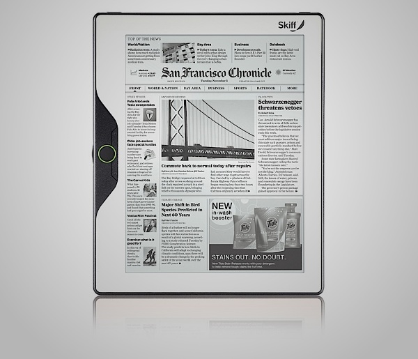Το Skiff Reader είναι μία εύκαμπτη οθόνη αφής για τους φανατικούς αναγνώστες. Ο πρωτότυπος αυτός e-Reader έχει ξεπεράσει μέχρι και το Amazon Kindle DX, που κατέκλυσε την αγορά το 2009. Διαθέτει μια οθόνη αφής 11,5-ιντσών με «ηλεκτρονικό-μελάνι» (e-ink), που επιτρέπει μια φιλική πλοήγηση στο χρήστη με τα δάχτυλα, καθώς μπορεί να γυρίζει τις e-σελίδες και να επιλέγει τα αγαπημένα σας κομμάτια από τα e-βιβλία σας!